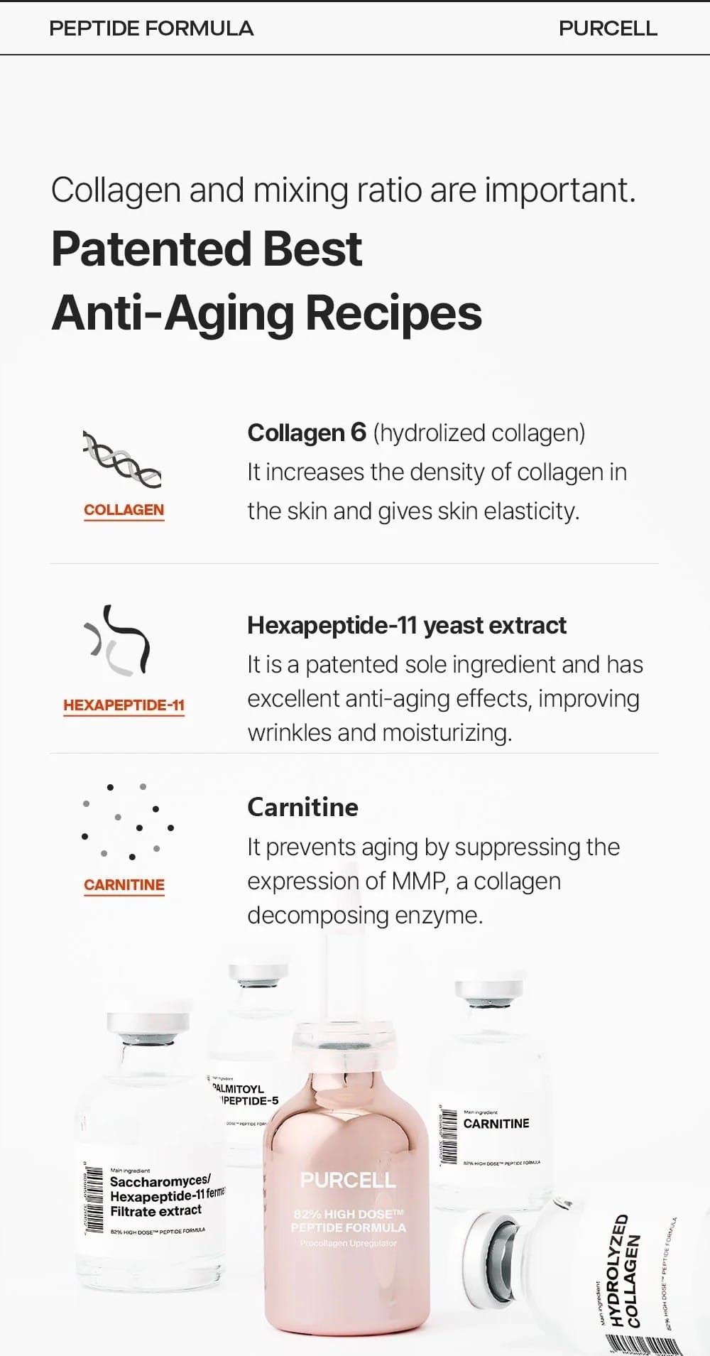 Krachtig anti-aging serum met 82% hooggeconcentreerde peptiden dat de huid onmiddellijk steviger laat aanvoelen en fijne lijntjes gladstrijkt. Hexapeptide-11 werkt gericht op rimpels, terwijl toegevoegd collageen de huid voller maakt en de huidtextuur verfijnt.